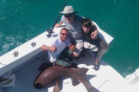We anchor the boat just minutes outside of the marina. Seasickness is never a issue in the calm, clear shallows near shore. We use fish carcasses to feed and bring in large sharks of all kinds. The bridge currents, in combination with the fish carcasses dumped in the area daily, make for a great spot to catch large Tarpon as well. Tarpon fishing is hugely popular for their size and lively action.